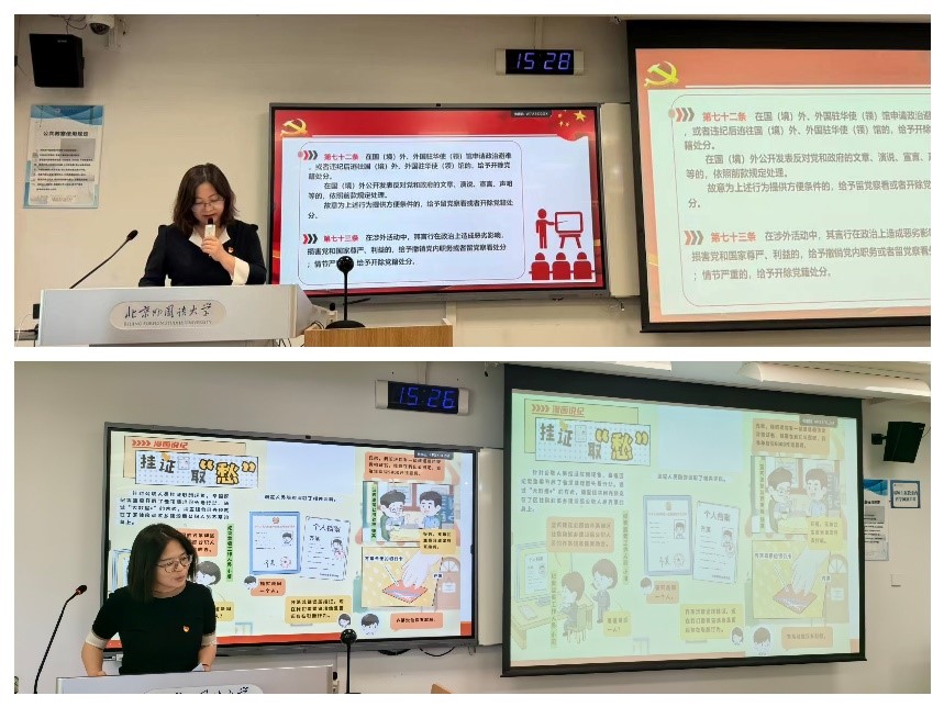 之后,为推动党纪学习教育在党员教师中走深走实,BBIN宝盈游戏官网教工一支部和二支部分别进行了支部党纪学习。一支部书记钟珊和二支部书记曾琼分别在本支部讲授专题纪律党课,两位书记以讲促学、以讲带学,结合具体案例对党员教师进行了警示教育。