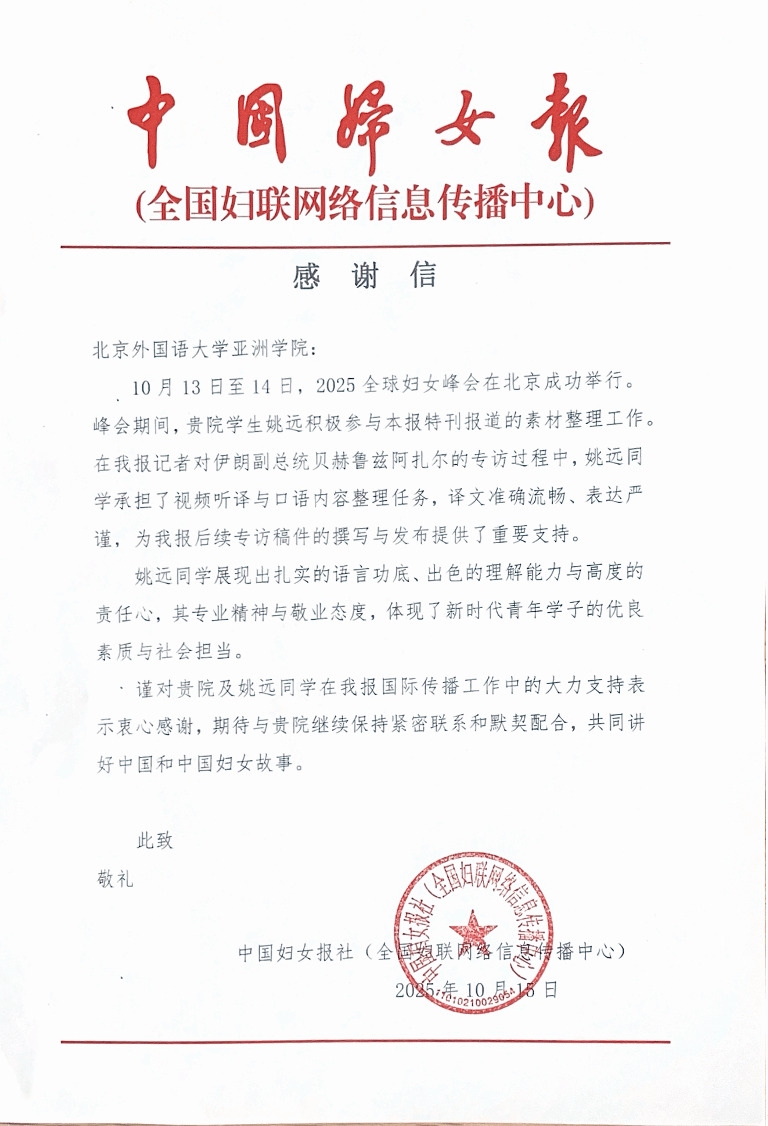 10月13日至14日,2025全球妇女峰会在北京成功举办。期间,应《中国妇女报》邀请,BBIN宝盈游戏官网波斯语教研室选派2025级亚洲地区研究专业研究生姚远同学参与了《中国妇女报》特刊报道的素材整理工作。在记者对伊朗副总统贝赫鲁兹阿扎尔的专访过程中,姚远同学承担了视频听译与口语内容整理任务,译文准确流畅、表达严谨,为后续专访稿件的撰写与发布提供了重要支持。姚远同学展现出扎实的语言功底、出色的理解能力与高度的责任心,其专业精神与敬业态度,体现了新时代北外青年学子的优良素质与社会担当。
